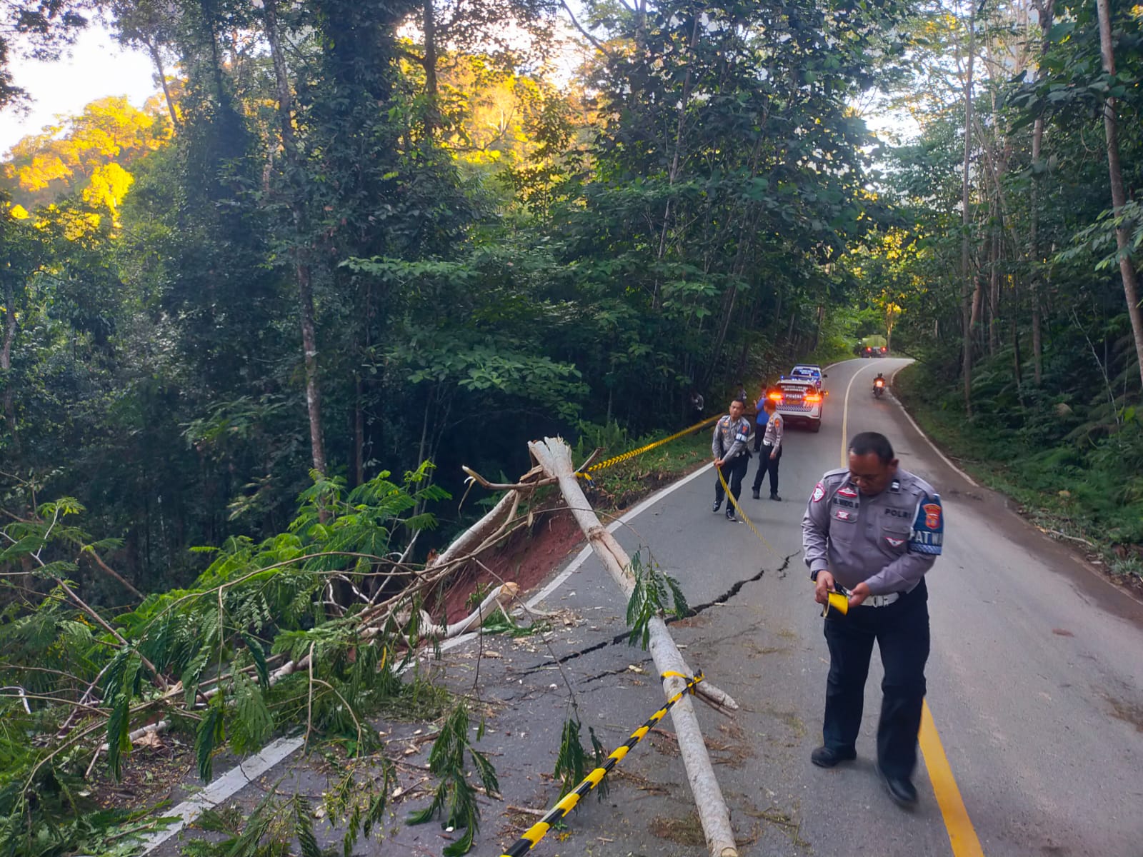 Kegiatan ini dipimpin langsung oleh Kasat Lantas Polres Berau, AKP Wulyadi, SH, bersama personel Unit Turjawali. Mereka melakukan pengecekan di titik trouble spot akibat intensitas hujan tinggi yang menyebabkan tebing longsor dan badan jalan tergerus. Material longsor menutupi sebagian badan jalan, sementara bahu jalan dan aspal mengalami kerusakan.