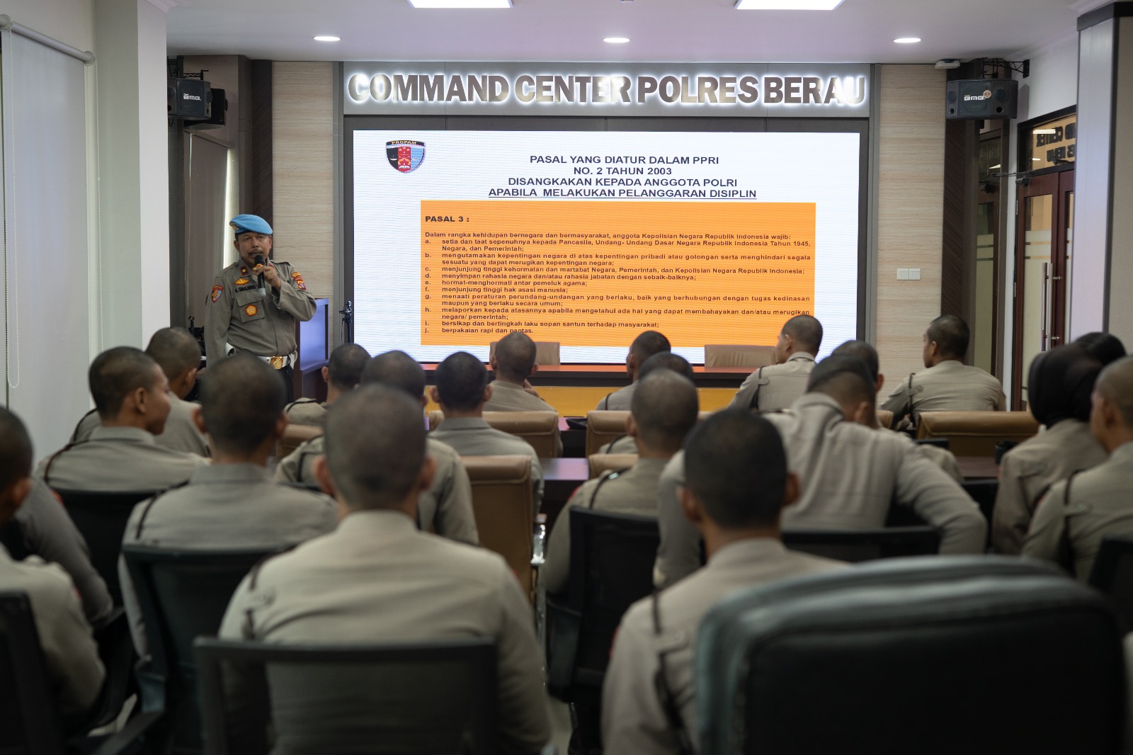 Dalam arahannya, Kasi Propam Polres Berau menyampaikan materi terkait Peraturan Pemerintah Nomor 2 Tahun 2003 tentang Peraturan Disiplin Anggota Polri, yang mengatur berbagai jenis pelanggaran disiplin serta konsekuensi atau sanksi yang dapat diberikan kepada anggota yang melanggar, seperti tidak melaksanakan tugas dengan baik maupun tindakan yang mencoreng nama baik institusi.