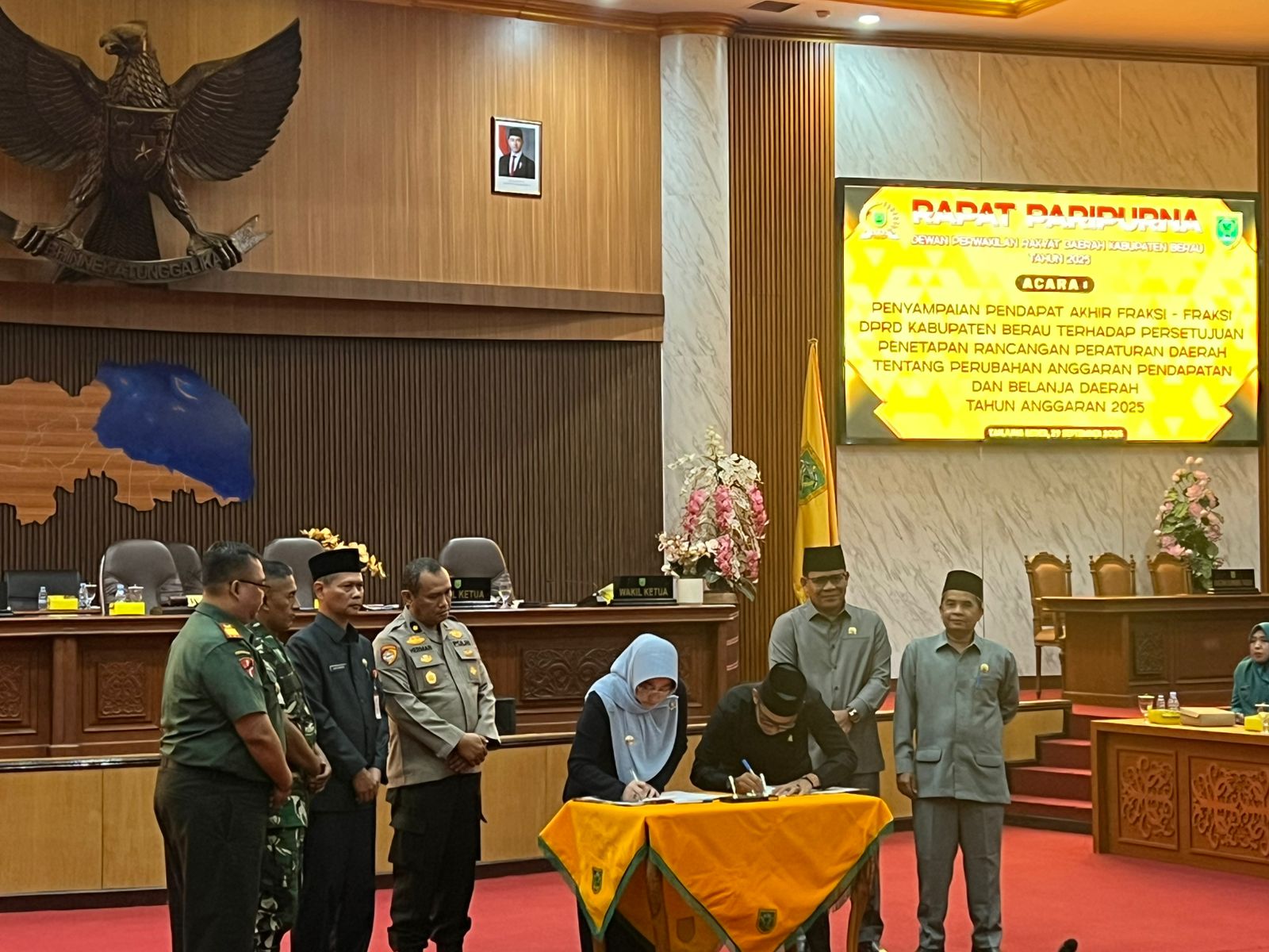 Tanjung Redeb, 29 September 2025 – Kabag Ren Polres Berau, Kompol Herman, S.Pd.I., M.H., menghadiri Rapat Paripurna DPRD Kabupaten Berau Tahun 2025 yang digelar di Gedung DPRD Berau, Jl. Gatot Subroto, Kelurahan Sei Bedungun, Kecamatan Tanjung Redeb. Rapat berlangsung pukul 14.00 hingga 16.45 WITA dengan agenda penyampaian pendapat akhir fraksi-fraksi DPRD terkait penetapan Rancangan Peraturan Daerah (Raperda) tentang Perubahan APBD Tahun Anggaran 2025.