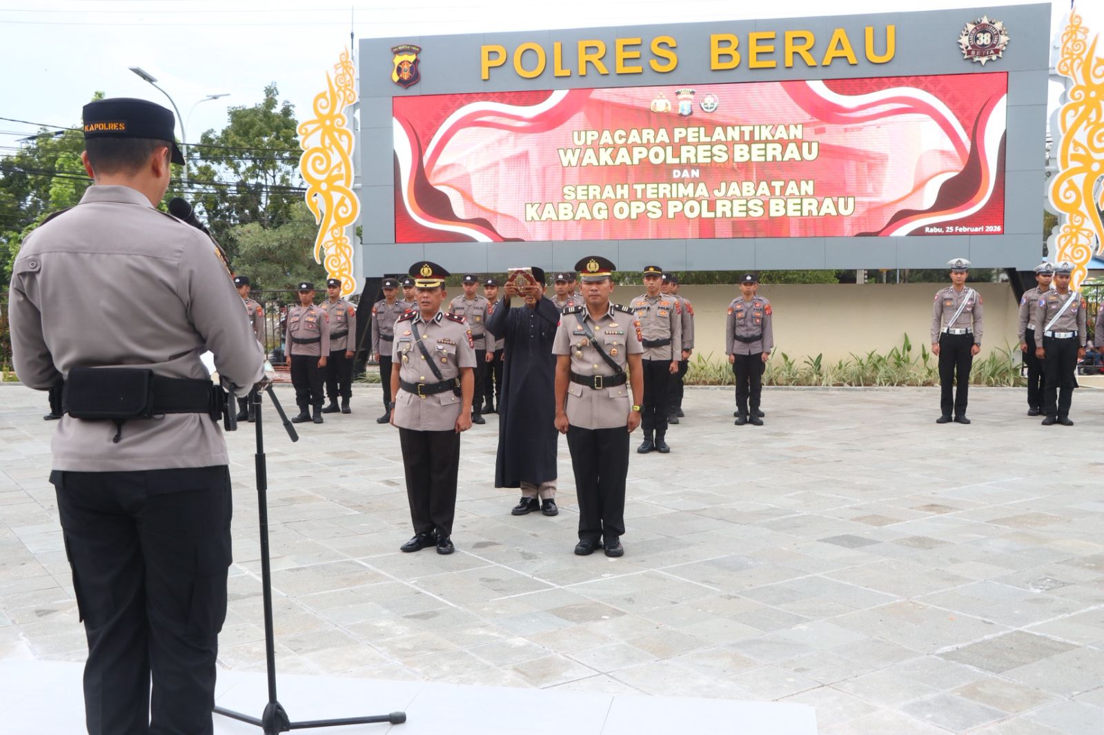 Polres Berau – Kapolres Berau AKBP Ridho Tri Putranto memimpin langsung upacara pelantikan Wakapolres Berau dan serah terima jabatan (sertijab) Kabag Ops Polres Berau yang digelar di halaman Polres Berau, Rabu (25/2/2026) pukul 17.30 Wita hingga selesai. Kegiatan berlangsung khidmat dengan diikuti pejabat utama dan jajaran Polres Berau.
