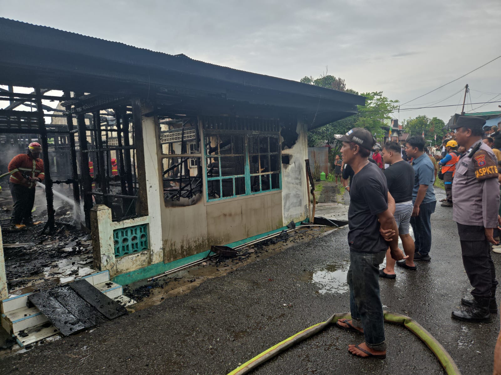 Melihat kejadian tersebut, saksi langsung berupaya mendobrak pintu rumah dan berlari ke bagian belakang untuk menyelamatkan barang-barang milik tetangga. Warga sekitar kemudian turut membantu melakukan pemadaman awal sambil menghubungi petugas pemadam kebakaran, PLN, dan pihak kepolisian.