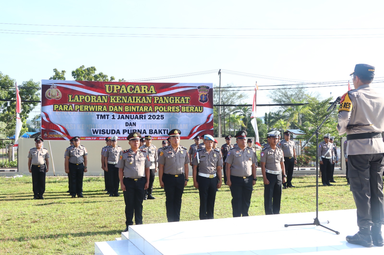 Polres Berau – Polres Berau melaksanakan upacara kenaikan pangkat dan wisuda purna bhakti di halaman Mako Polres Berau, Jl. Gatot Subroto, Kelurahan Sei Bedungun, Kecamatan Tanjung Redeb, pada Senin 30 Desember 2024. Kegiatan ini sekaligus menyambut Tahun Baru 2025 dengan semangat dan penghargaan kepada para personel yang telah berdedikasi.
