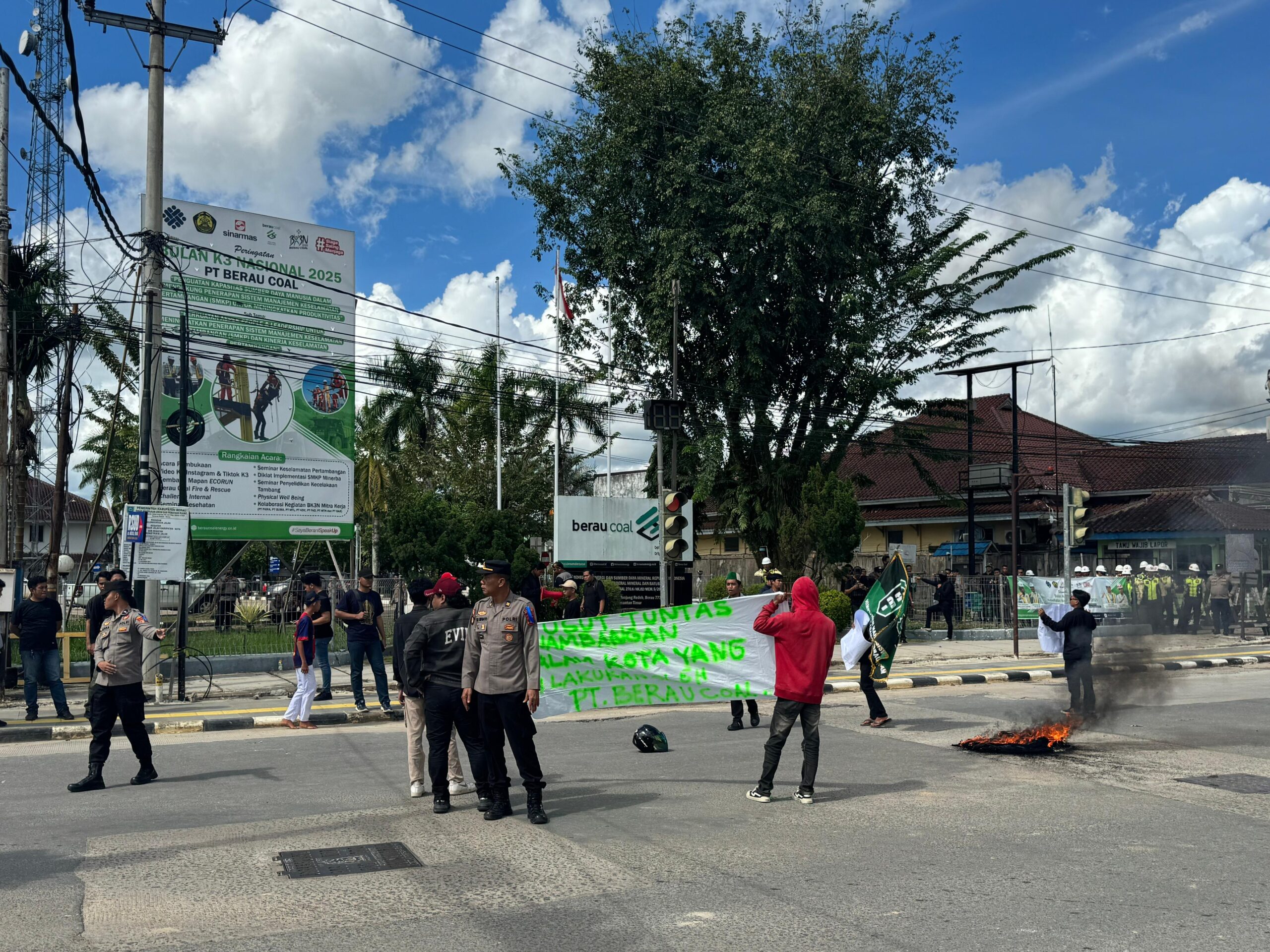 Berau – Polres Berau mengawal jalannya aksi unjuk rasa yang digelar oleh Himpunan Mahasiswa Islam (HMI) Cabang Berau di depan Kantor Head Office PT. Berau Coal, Jl. Pemuda, Kecamatan Tanjung Redeb, Rabu (12/2/2025). Aksi yang berlangsung sejak pukul 14.30 WITA ini menyoroti isu lingkungan, sosial, dan ekonomi akibat aktivitas pertambangan perusahaan tersebut.