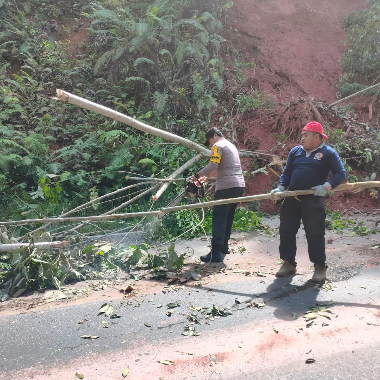 Polres Berau – Personel Polsek Kelay bersama Badan Penanggulangan Bencana Daerah (BPBD) Kecamatan Kelay melakukan aksi cepat tanggap dengan membersihkan pohon tumbang yang menghalangi akses jalan di KM 102 Jalan Poros Berau–Samarinda, Kecamatan Kelay, Kabupaten Berau, pada Senin, 5 Mei 2025 pukul 10.00 WITA.