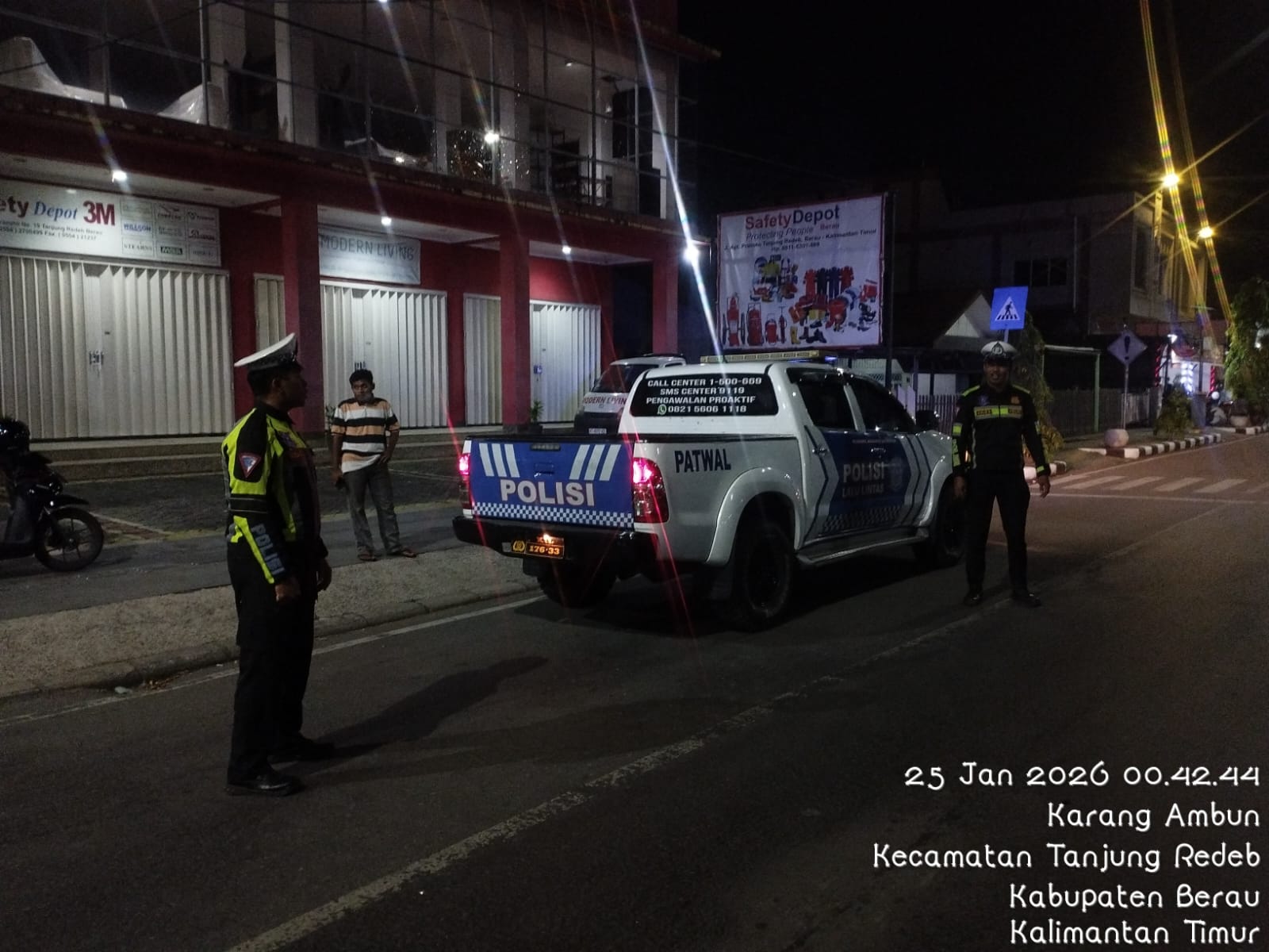 Polres Berau – Personel Unit Turjawali Satuan Lalu Lintas Polres Berau melaksanakan kegiatan patroli rutin dalam rangka menjaga keamanan, keselamatan, ketertiban, dan kelancaran lalu lintas (Kamseltibcar Lantas) di wilayah Kabupaten Berau, Minggu dini hari (25/1/2026).