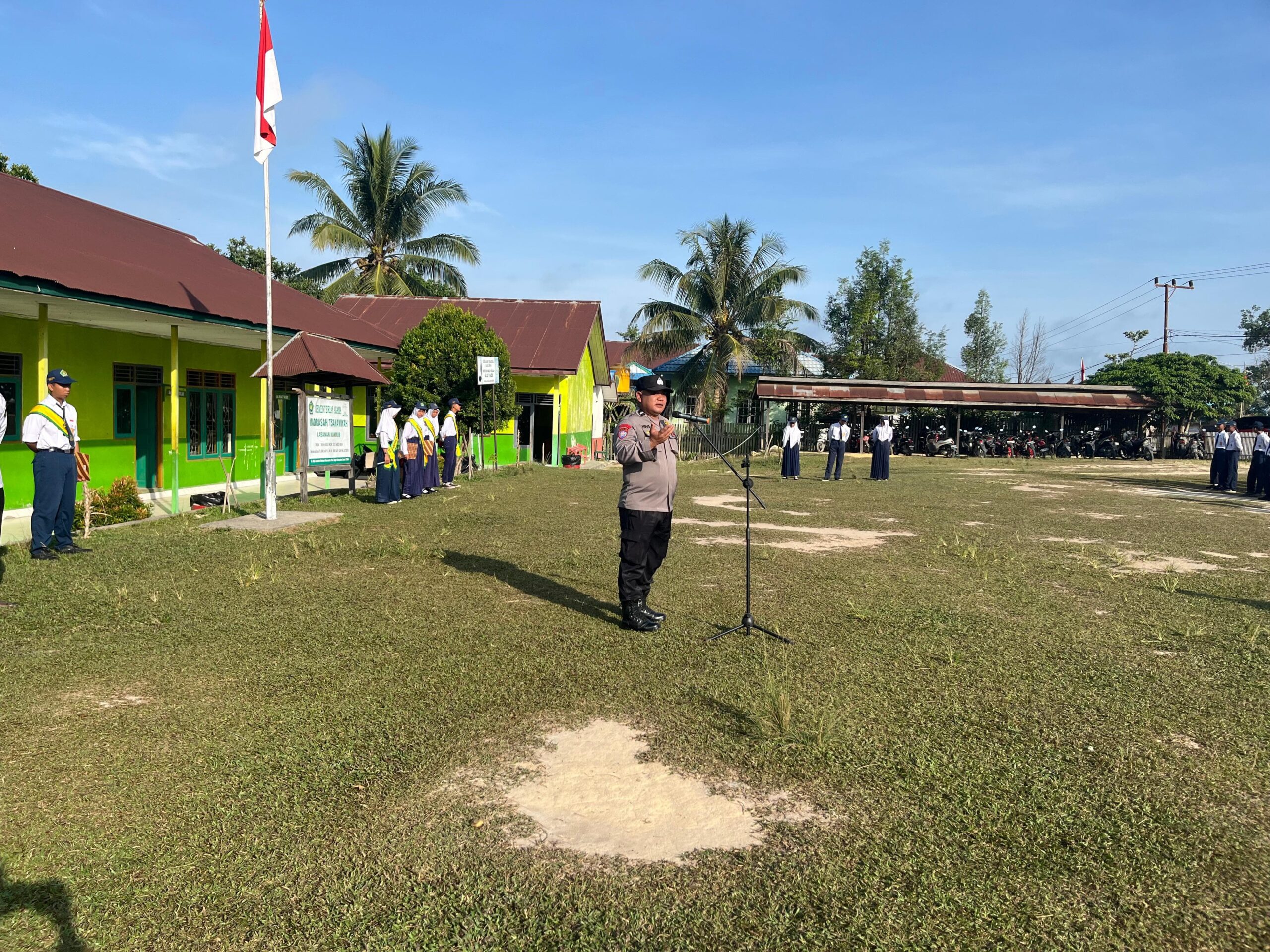 Teluk Bayur, 4 November 2024 – MTS Labanan Makmur menggelar upacara rutin yang dipimpin oleh Kapospol Labanan, Aipda Agus J.P, pada Senin pagi di lapangan sekolah. Upacara yang dimulai pukul 07.15 WITA ini dihadiri oleh 180 siswa, para guru, dan staf sekolah, serta Bhabinkamtibmas Kampung Labanan Makmur, Brigpol Sanusi.